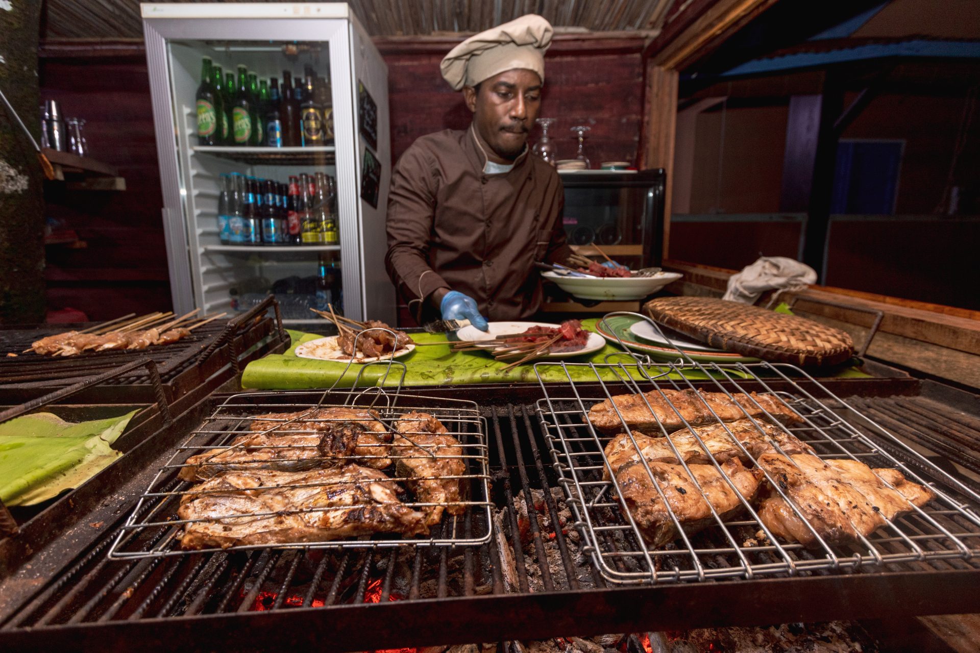 Au Repaire des Pirates, chaque plat prend vie sous vos yeux grâce au talent de notre chef. Poissons frais, viandes savoureuses et brochettes variées sont préparés directement sur les braises ardentes, pour révéler toute la richesse des saveurs locales.